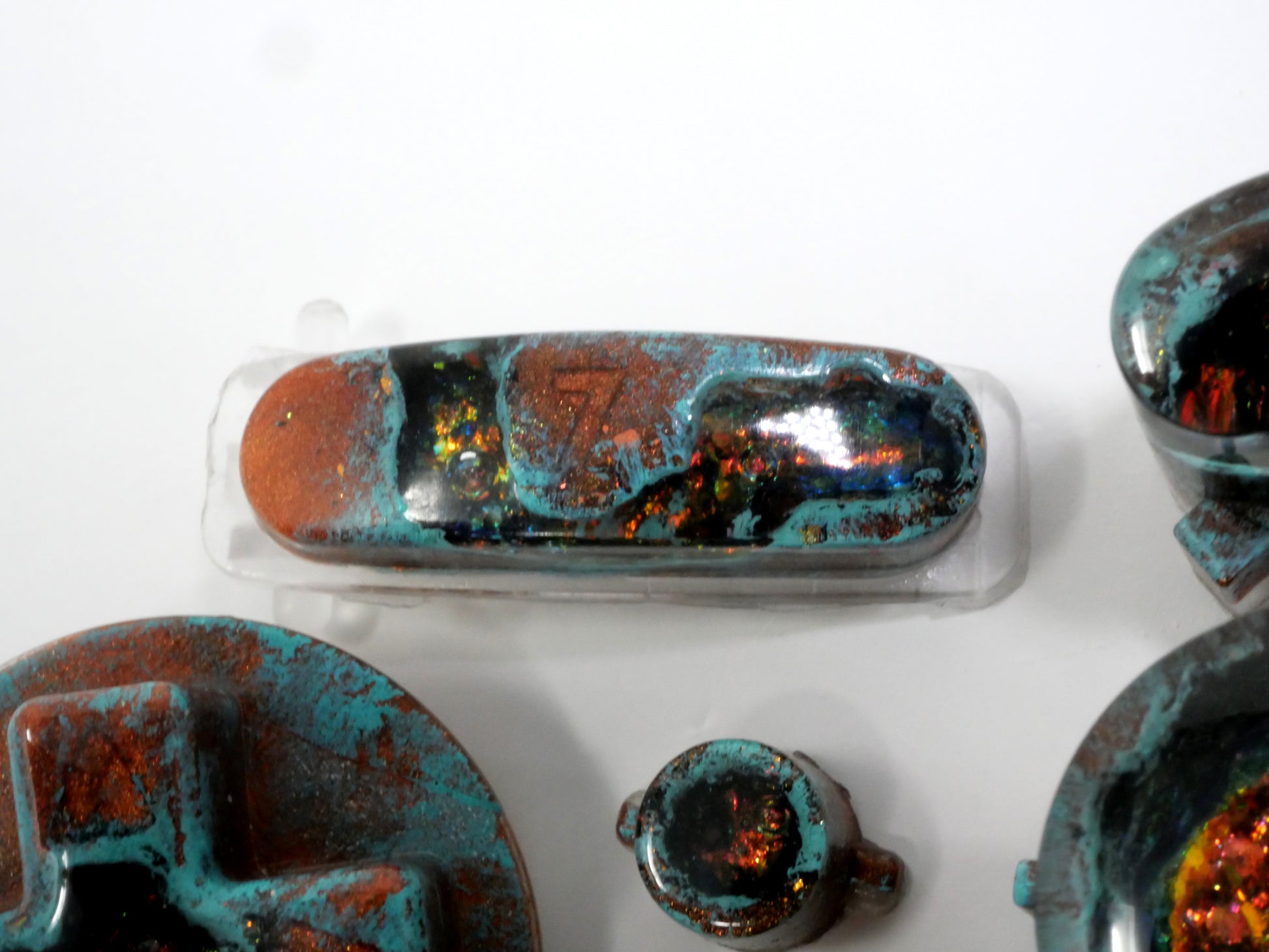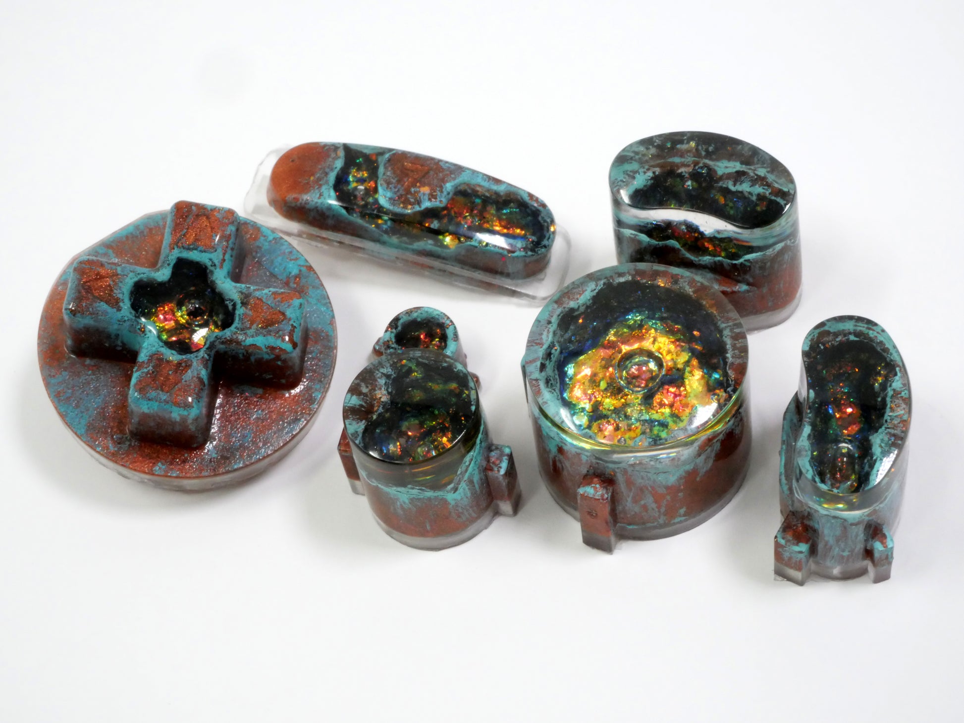 Handmade rusted copper pipe inspired resin button set for a gamecube controller. D-pad, start, ABXY and Z buttons included. Multi step process buttons to make, made with multi color flake and hand painted patina.