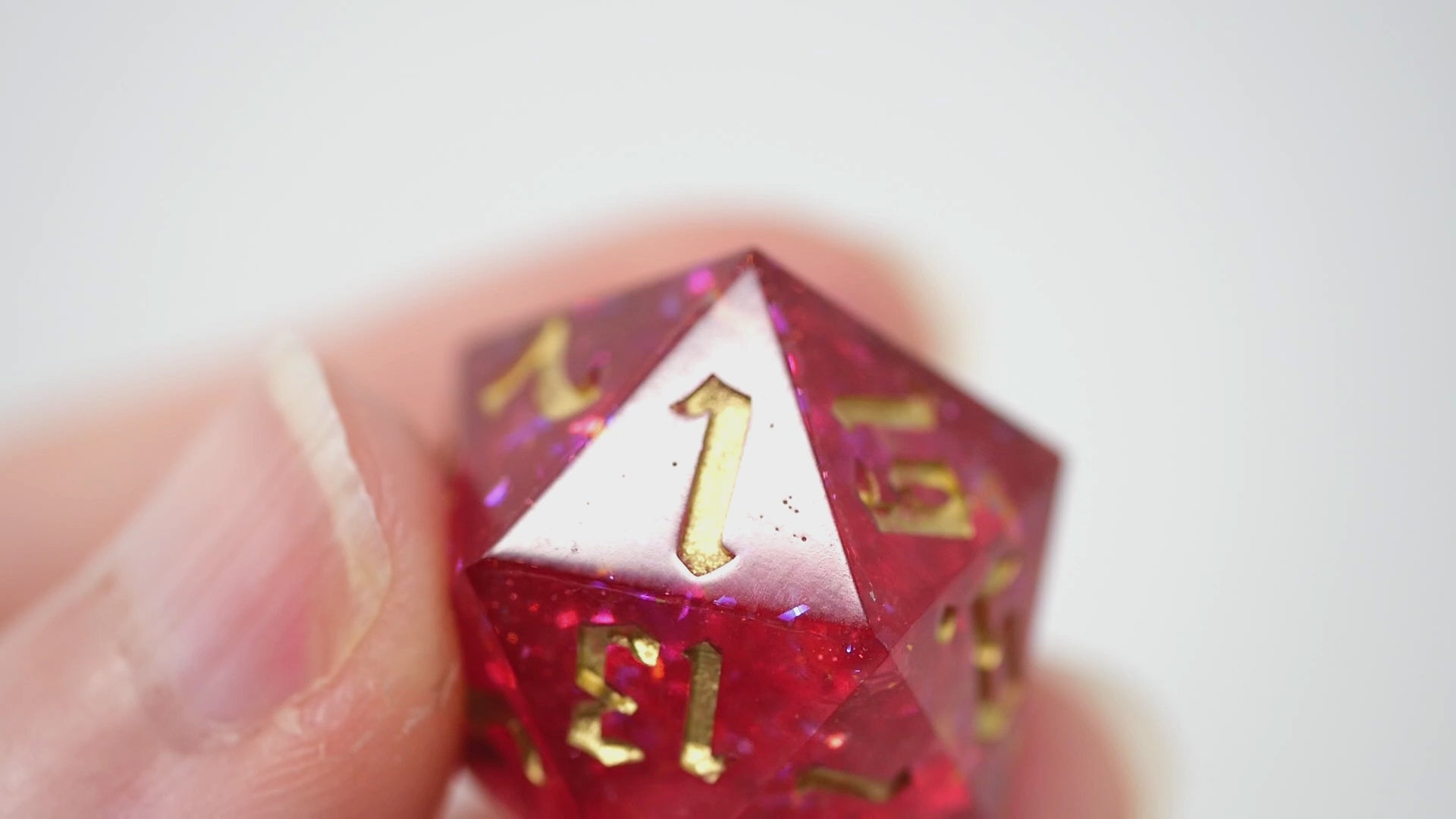 Handmade full set of dice for DnD play. Made from hard urethane resin that resists scratches and includes an additional D4 crystal shaped die. Some minor surface bubbles or flaws are present on all of the "1" side of the dice and is discounted for that reason. A dice bag is included!