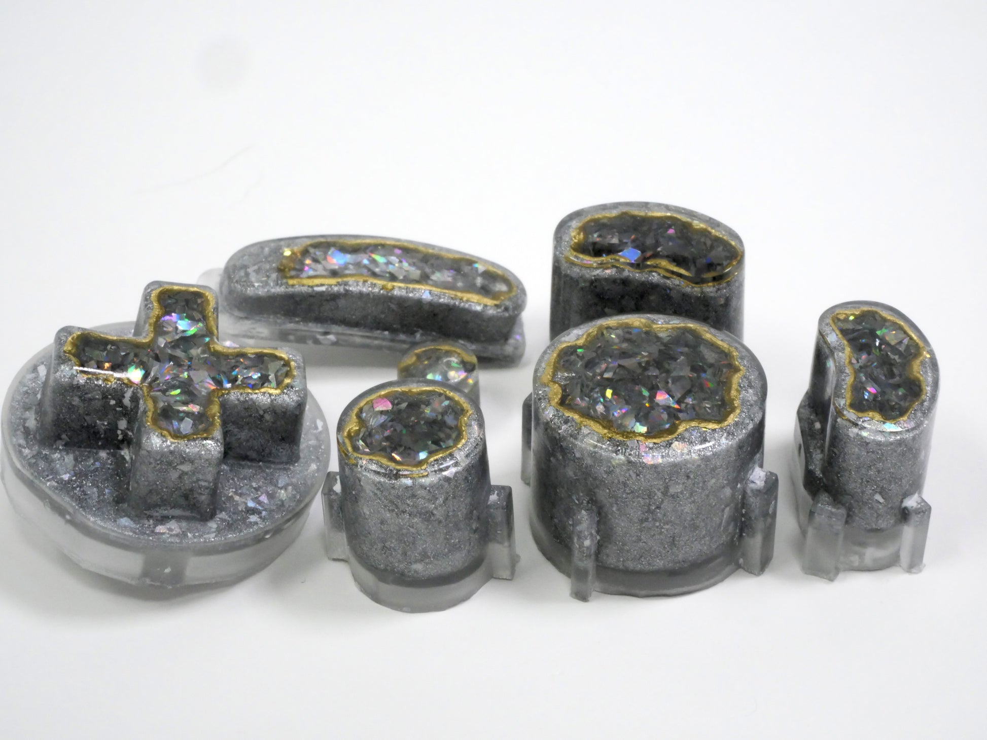 Handmade geode inspired resin button set for a gamecube controller. D-pad, start, ABXY and Z buttons included. Multi step process buttons to make, made with a silver flake with multi colors.